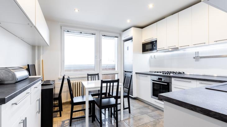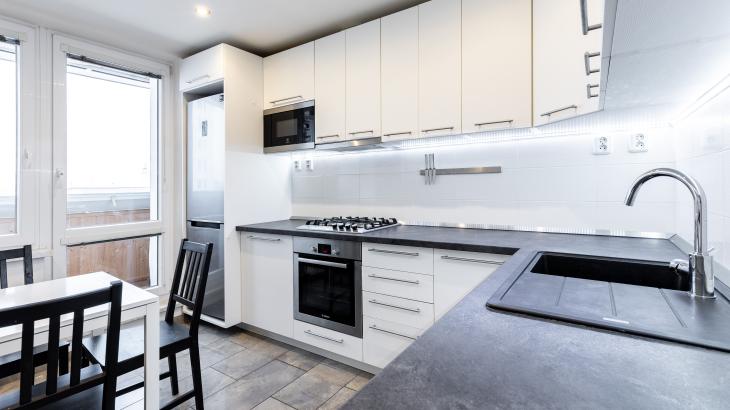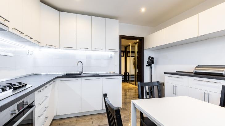 Kuchyňská linka zhotovena na míru včetně spotřebičů, k dispozici dostatek prostoru pro jídelní stůl.