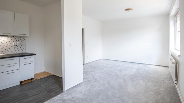Byt je ve druhém podlaží domu, v prvním podlaží je k dispozici garáž. Byt má moderní dispoziční řešení, obývací pokoj je oddělen malou příčkou od kuchyňského koutu. Kuchyňská linka byla na míru zhotovena v minulém roce.