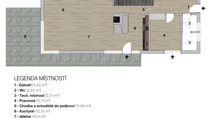 Dispozice 1. NP tvoří vstupní zádveří, koupelna, samostatné WC a pokoj, který může sloužit jako ložnice pro hosty, pracovna či herna. Dominantou podlaží je vzdušný obytný prostor s moderní kuchyní, propojenou s jídelní částí a prostorným obývacím pokojem, mezi nimiž je umístěn stylový krb. Velkoformátová okna zajišťují dostatek denního světla a plynule propojují interiér s exteriérem. Z obývací části je přímý vstup na zastřešenou terasu.