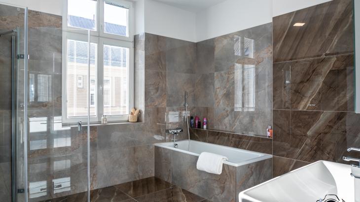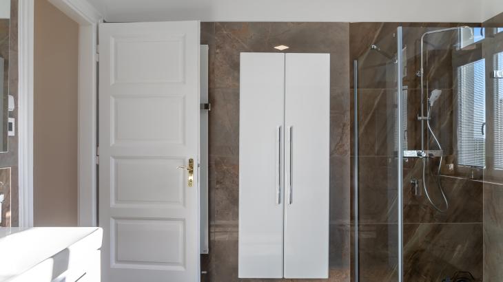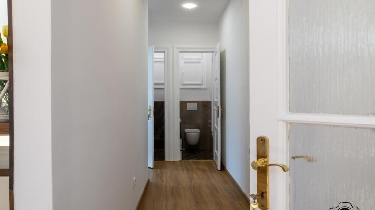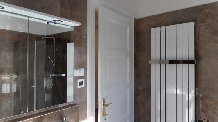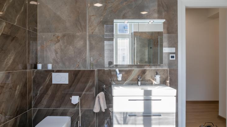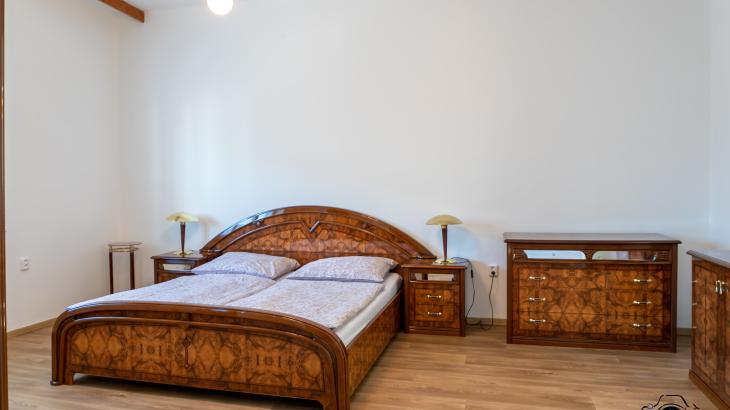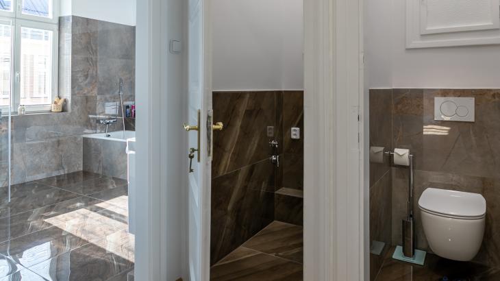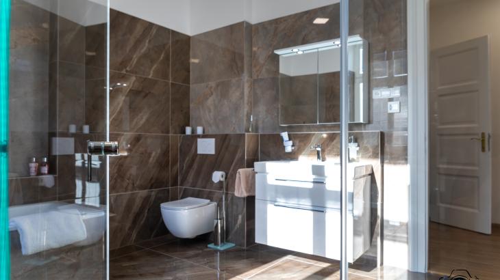 Prostorná koupelna disponuje vanou, sprchovým koutem a toaletou. Druhá toaleta je v samostatné místnosti.