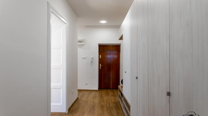 Byt je ve čtvrtém patře, dispozičně řešený jako 3+kk. Dominantou bytu je obývací pokoj s kuchyní. Kuchyňská linka zhotovená na míru včetně vestavných spotřebičů.