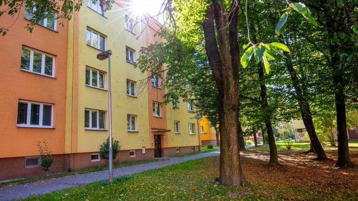 Byt je v prvním patře nízkopodlažního domu po revitalizaci.