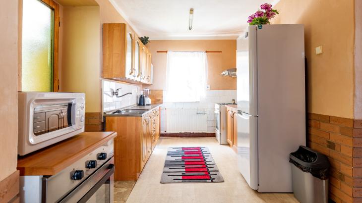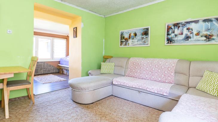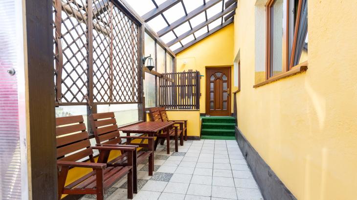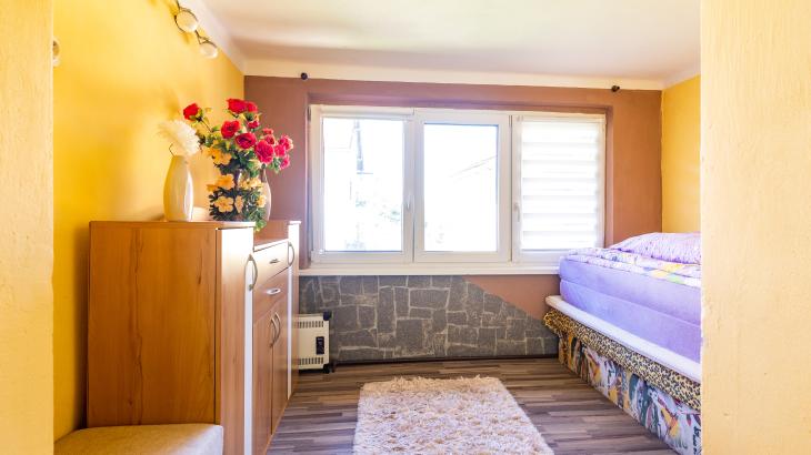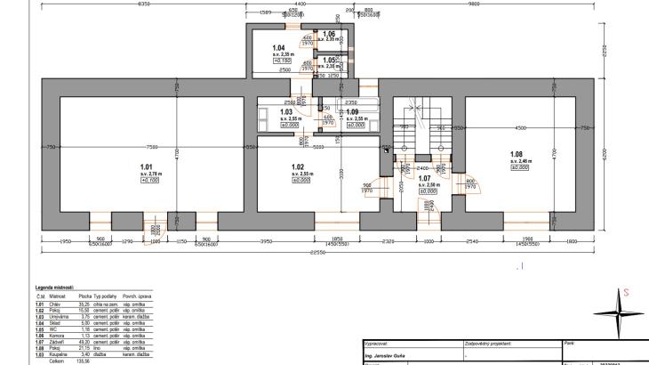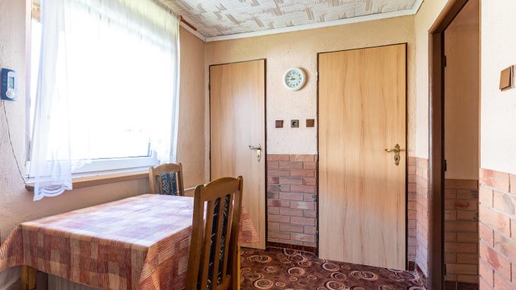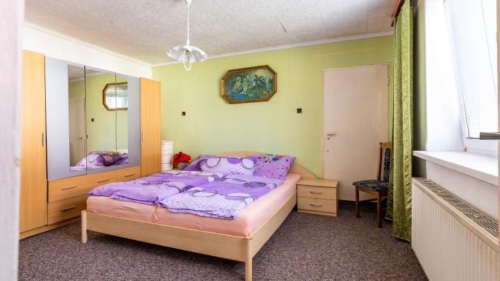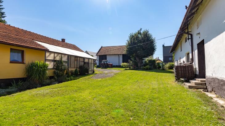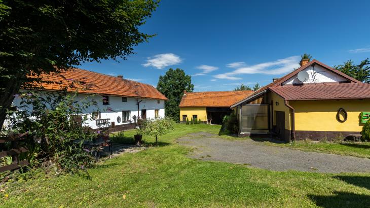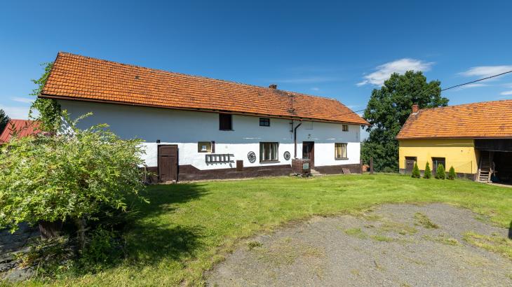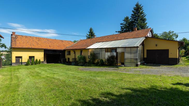 Zádveří, koupelna, WC, kuchyně, 4 pokoje, spíž, terasa před domem, garáž. Na dům navazuje hospodářská část se stodolou a chlévy.