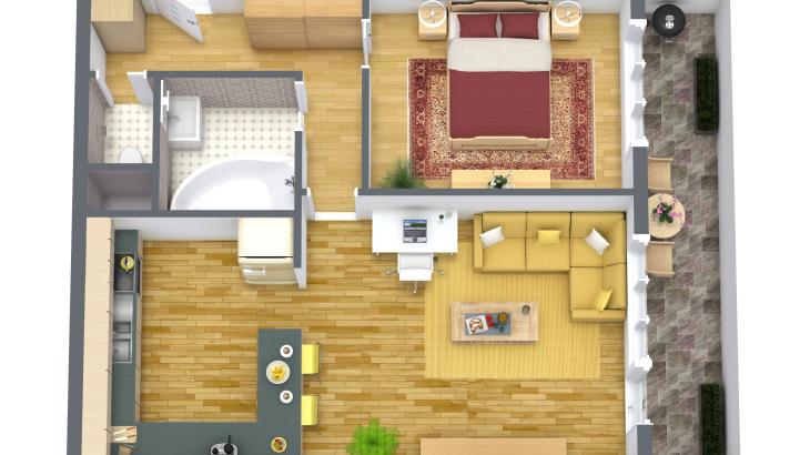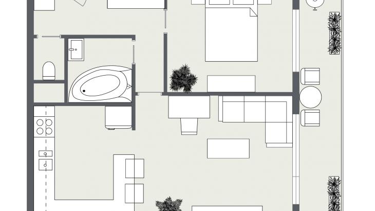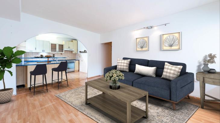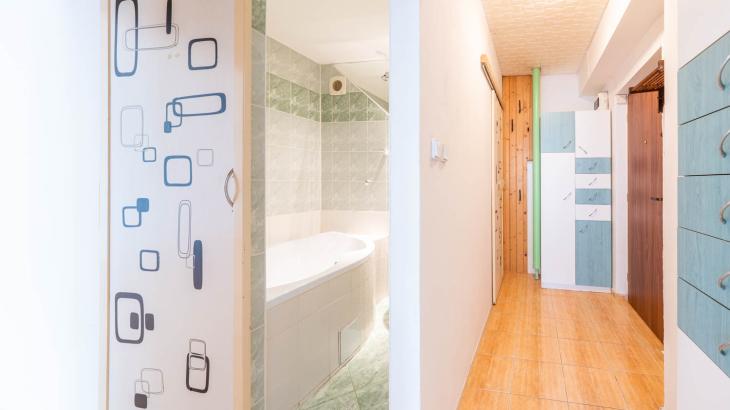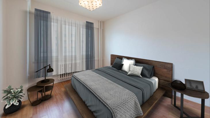 Pokoje jsou neprůchozí, přístupné z chodby. Dominantou bytu je obývací pokoj spojený s kuchyní, ze kterého je vstup na zasklenou lodžii, která je přes šíři obou pokojů a má výměru úžasných 8 m2.