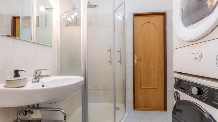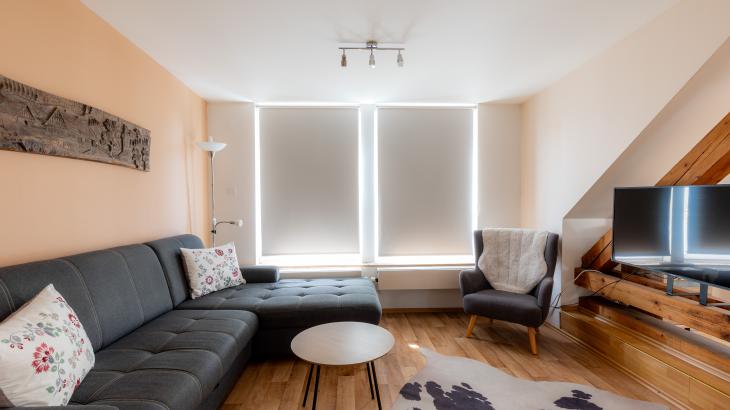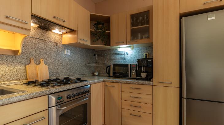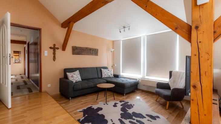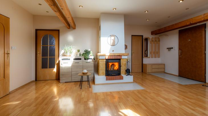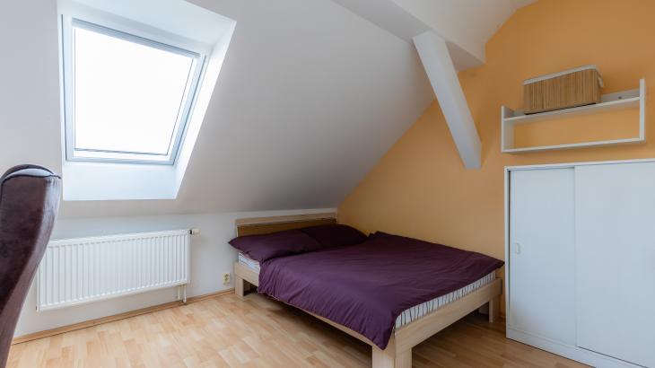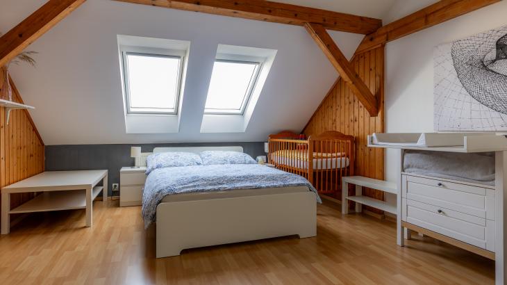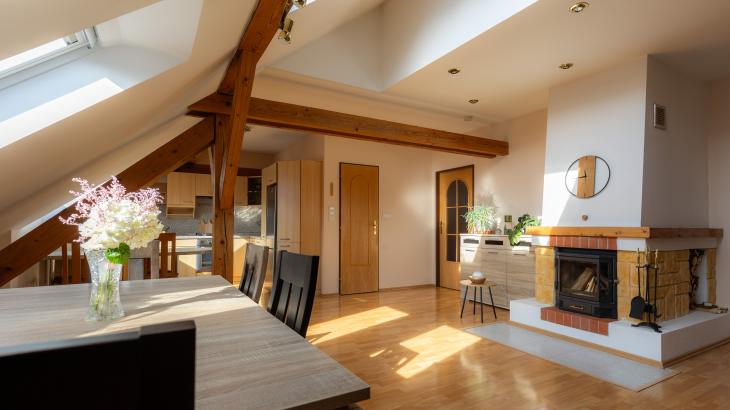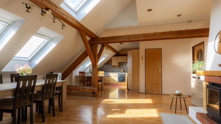 Tato nemovitost zaujme především svou velkorysostí, vzdušností a variabilitou. Srdcem bytu je impozantní otevřený prostor propojující kuchyni, jídelnu a obytnou halu – místo, které přirozeně spojuje rodinu i přátele. Atmosféru zde podtrhuje krb a dostatek denního světla díky kvalitním střešním oknům, která jsou na jižní straně doplněná žaluziemi. Komfort v letních měsících zajišťuje klimatizace.
