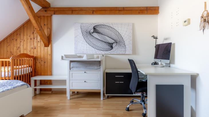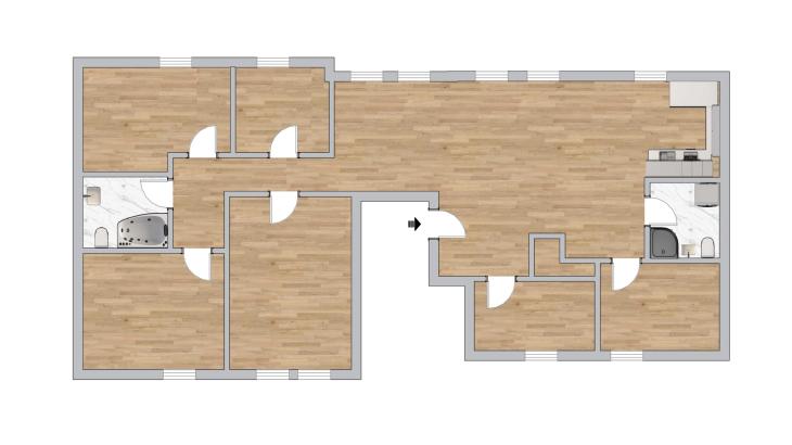 Byt je prakticky propojen na dvě samostatné části. V první se kromě hlavního obytného prostoru nacházejí dva pokoje a koupelna se sprchovým koutem. Druhá část nabízí ložnici, dva další pokoje, pracovnu a druhou koupelnu. Díky sádrokartonovým příčkám lze dispozici flexibilně upravit dle vlastních představ.