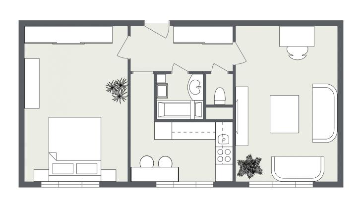 Jako bonus bude novému uživateli ponechána kvalitní šatní skříň v jednom z pokojů, kdy bude jen na vás, jestli to bude ložnice, nebo obývací pokoj.